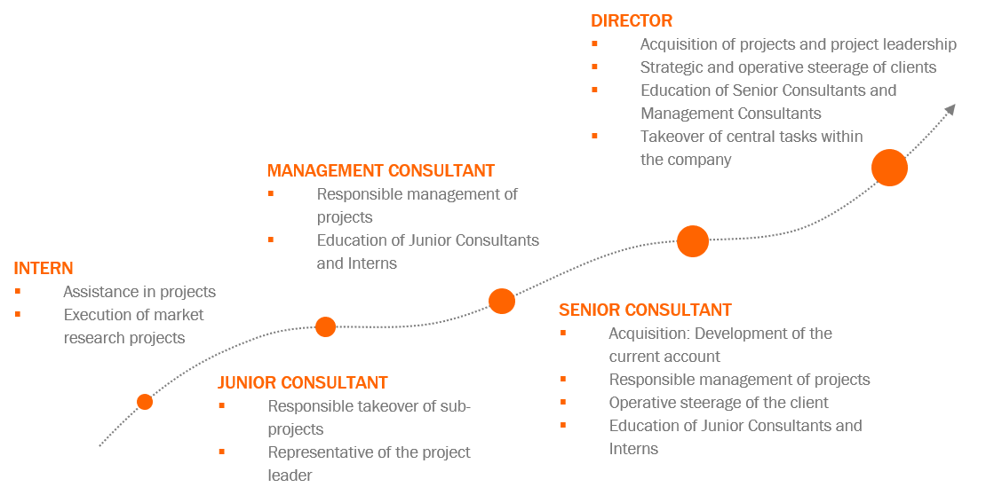 The recruitment of interns is conducted by our Intern Management while the job interviews for permanent positions are executed by the management. Applications for the positions of Junior Consultant and Management Consultant also have the possibility to get to know their future colleagues over lunch and ask open questions.