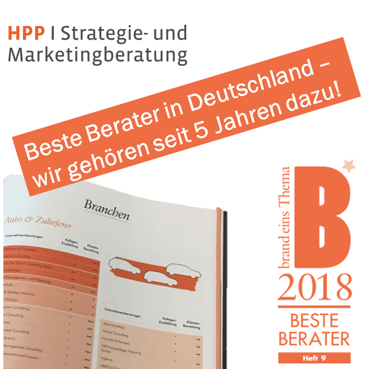 HPP zählt auch dieses Jahr, inzwischen zum siebten Mal in Folge, zu den besten Beratern Deutschlands gemäß der Beurteilung des Wirtschaftsmagazins brand eins. Wir wurden in den Branchen „Auto & Zulieferer“ sowie „Technologie & Telekommunikation“ ausgezeichnet und auch in den Beratungsfeldern „Strategieentwicklung“, „Vertrieb, After-Sales, CRM“ und „Marketing, Marke, Pricing“ konnten wir uns erneut platzieren.