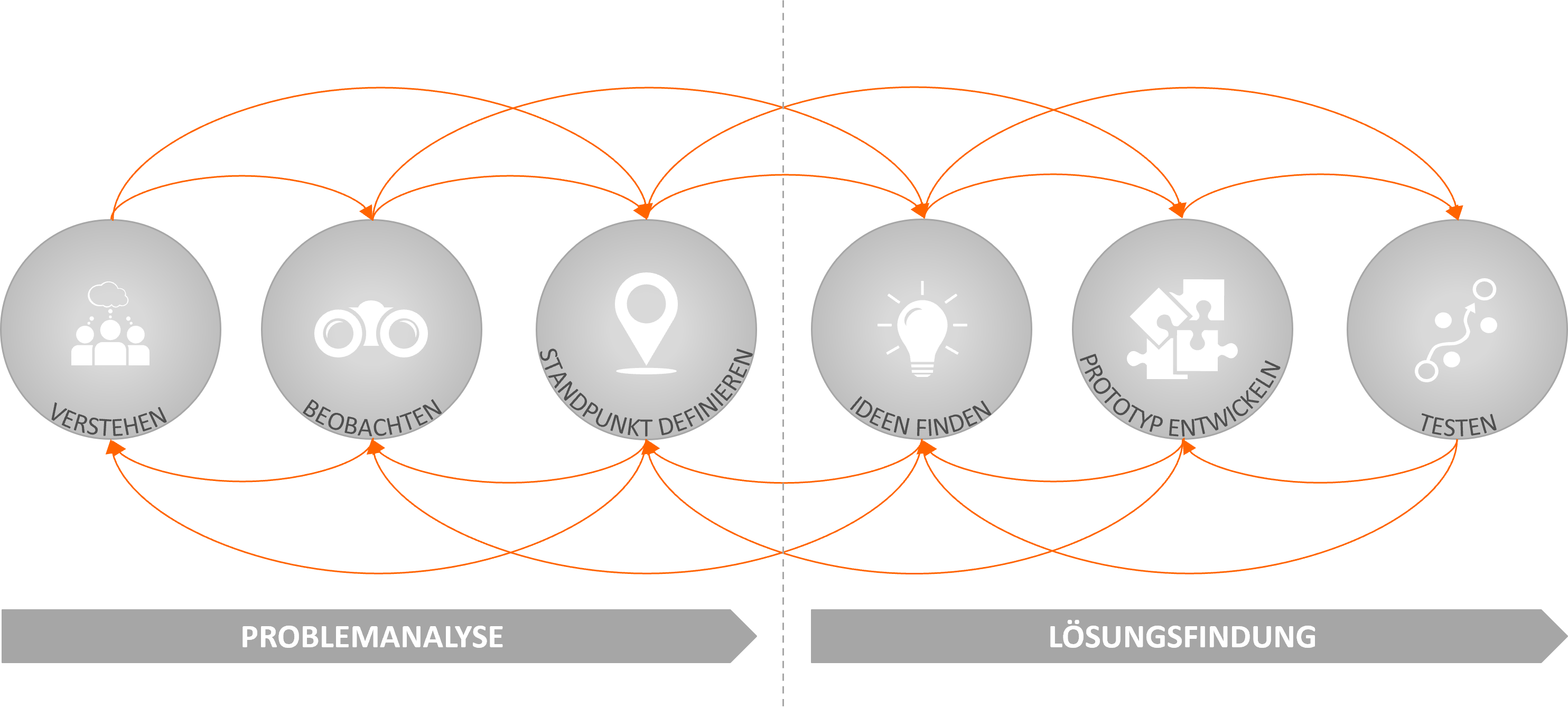 Design Thinking ist in sechs Phasen gegliedert, die ein strukturiertes Vorgehen bieten, um von einer vagen Idee zu einer durchdachten, auf den Nutzer ausgerichteten Lösung zu gelangen: