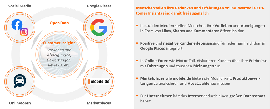 Die Grundlage des Ansatzes bilden öffentlich zugängliche Daten im Internet (Open Data). Je nach Erkenntnisinteresse ist das relevante Datenvolumen dabei enorm: Täglich bewerten Menschen auf sozialen Medien und in Onlineforen Produkte, Dienstleistungen und Erlebnisse mit einem Unternehmen, sprechen über ihre Erfahrungen mit den jeweiligen Marken und tauschen Meinungen und Empfehlungen aus.