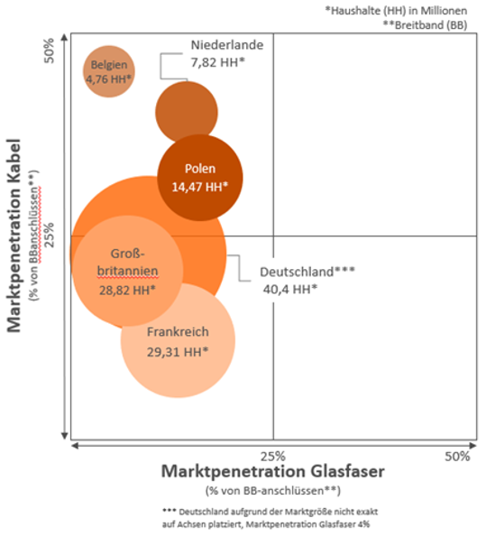Märkte wie Frankreich und Großbritannien dagegen haben heute noch eine Überzahl an DSL Anschlüssen. Um Zukunftsziele zu erreichen liegt der Fokus daher überwiegend auf Glasfaser.
