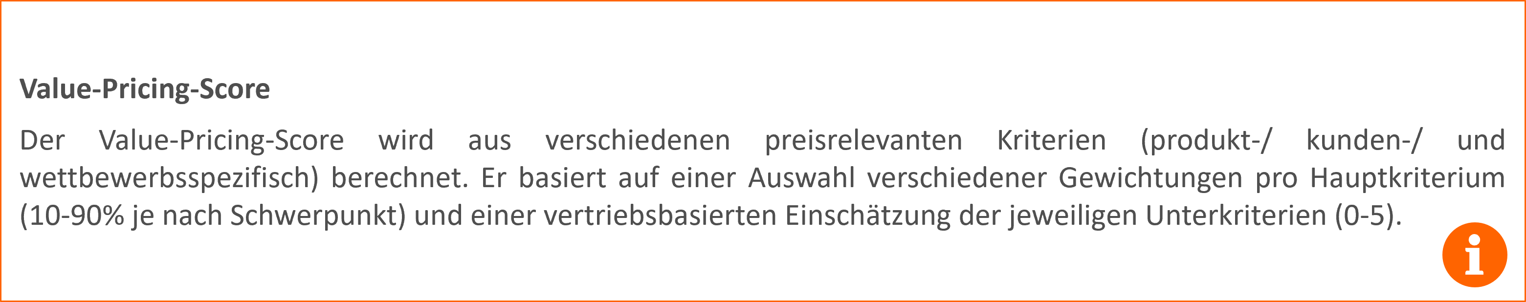 - sowie Value-Pricing-Scores auf Kosten- und Wettbewerbsbasis.