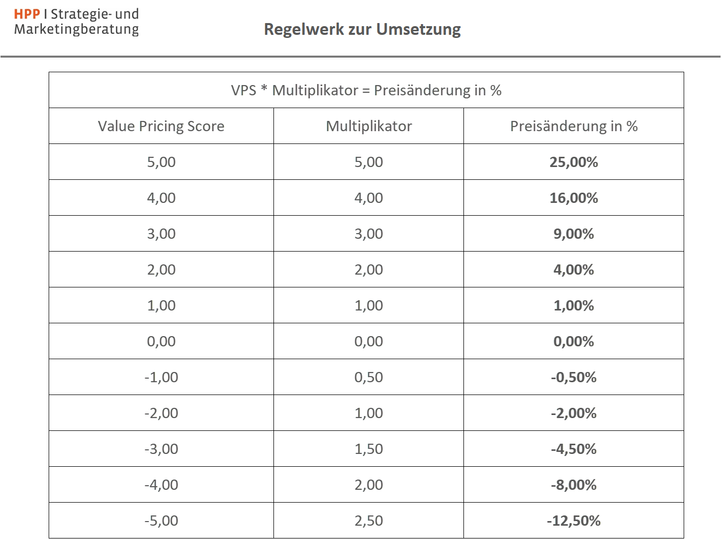 HPP verwendet für die Preisbestimmung mittels Value-Based-Pricing den sog. Value-Pricing-Score. Bei dieser Methode wird ein Gewichtungsfaktor (Score) aus allen preisrelevanten Kriterien berechnet, die unter anderem die relative Wettbewerbsstärke, den Kundennutzen und eine Einschätzung des Produktes/der Dienstleistung aus Vertriebssicht einschließen.