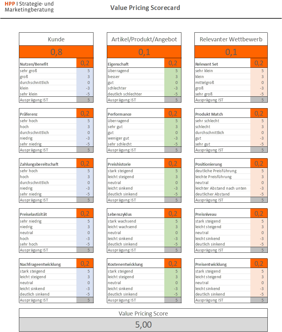 HPP arbeitet beim Value-Based-Pricing mit einer Scorecard, die die drei oben genannten Kategorien Kunde, Produkt/Dienstleistung und Wettbewerbssituation verwendet, um schließlich einen Value-Pricing-Score zu ermitteln. Dabei werden den jeweiligen Ausprägungen der Unterkategorien Bedeutungsgewichte zugeordnet, welche dann in ein Gesamturteil (den Value-Pricing-Score) eingehen. Zu beachten ist hierbei, dass die Bedeutungsgewichte der einzelnen Kategorien (Kunde, Produkt, Wettbewerb) situations-bedingt angepasst werden können. Soll z.B. dem Wettbewerb eine höhere Relevanz beigemessen werden, da im zugrundeliegenden Markt eine hohe Wettbewerbsintensität herrscht, kann der Faktor (hier 0,1) auf einen höheren Wert angehoben werden, sofern die Gesamtsumme aller drei Kategorien keine 100% übersteigt. Zudem ist auch eine Anpassung der Gewichtung der Unterkriterien möglich (je nach Markt, Kunden- und Wettbewerbssituation).